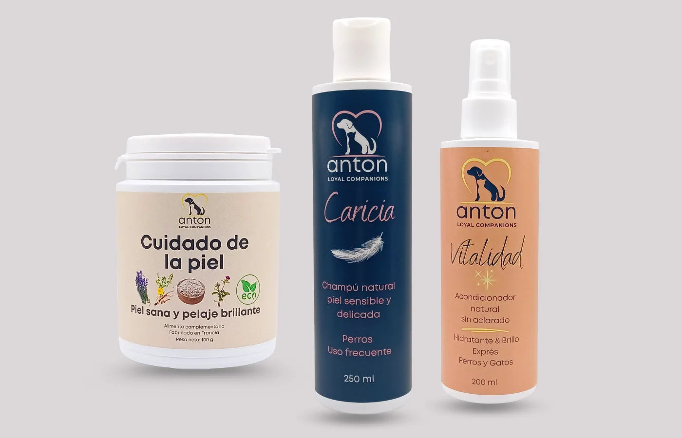 Pack natural con champú, acondicionador y suplemento ECO que calma picores, hidrata la piel sensible y refuerza el pelaje de perros y gatos.