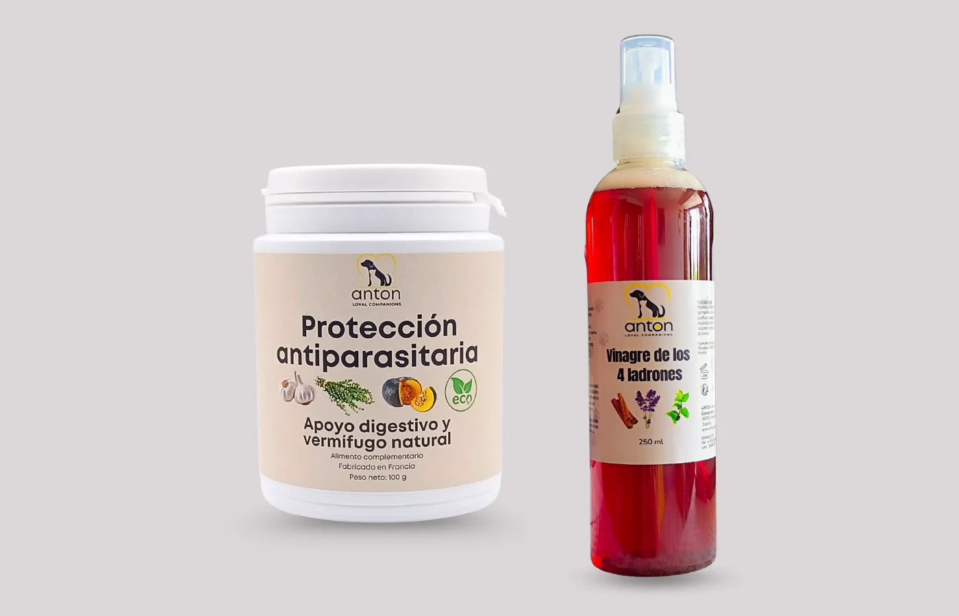 Pack 360° con suplemento antiparasitario ECO que crea un entorno intestinal desfavorable para parásitos internos y vinagre natural que protege la piel frente a parásitos externos e irritaciones.