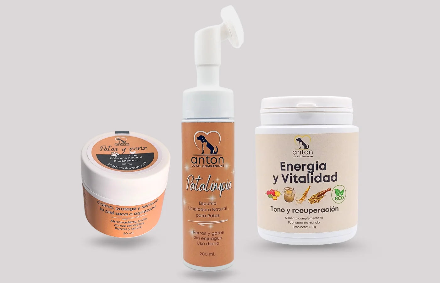 Tres cuidados naturales y ecológicos en un solo pack: energía y defensas, limpieza práctica tras los paseos y protección de almohadillas y trufa.